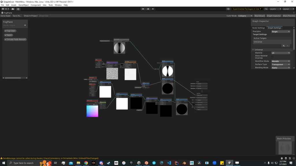 - The fog shader uses the camera depth to fade the scene to an opaque color and it also fades around the edges of buildings to give them a more permanent feeling. This is layered with the cloud shader to make more complex shapes and a more believable look.