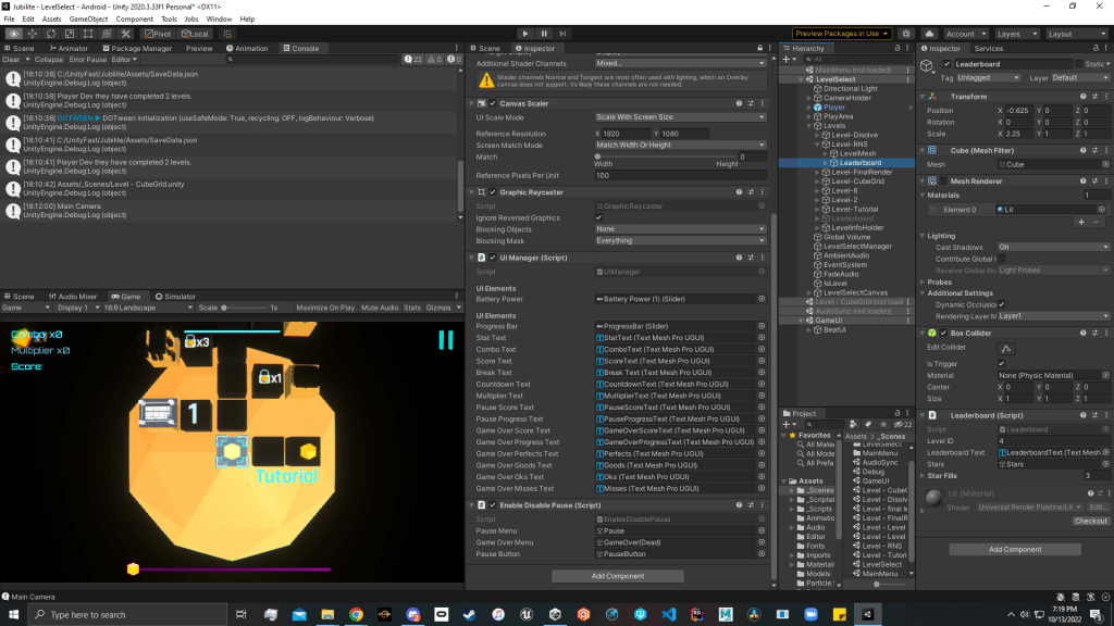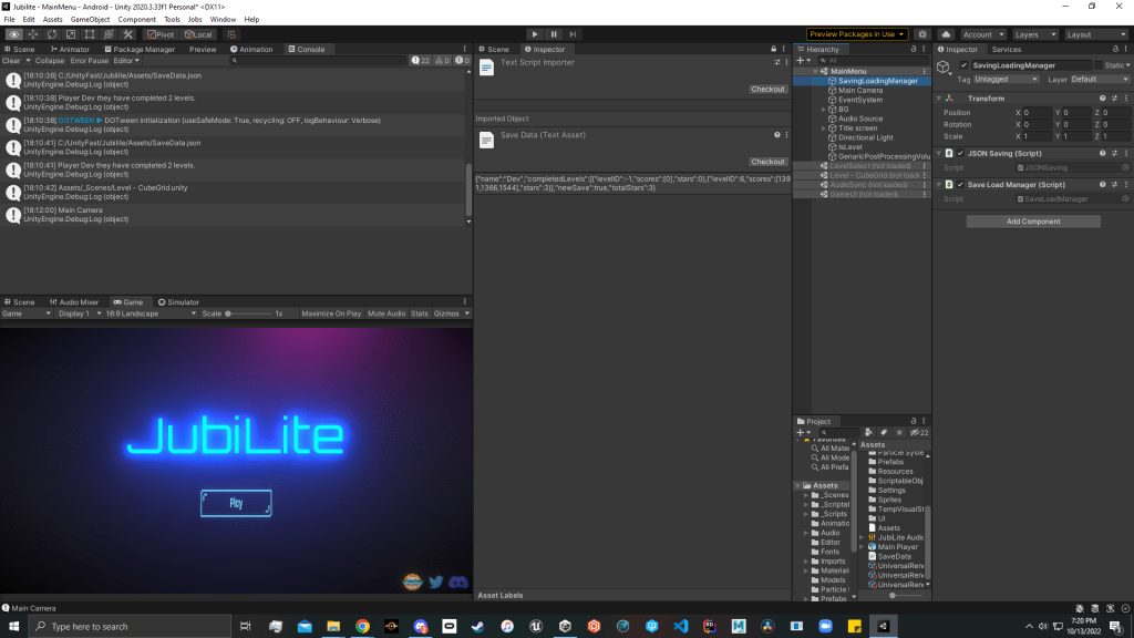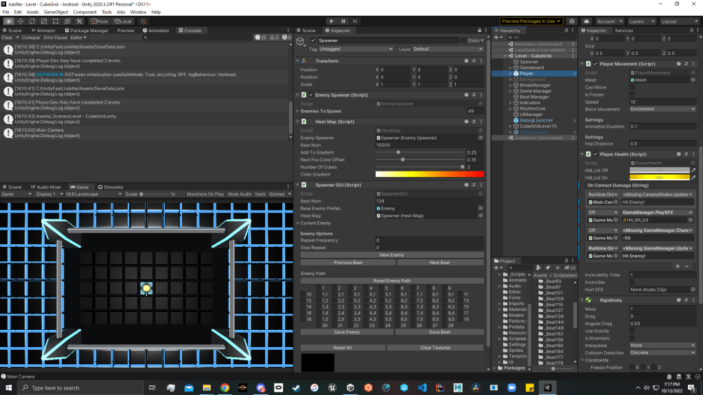 JubiLite is a project I and a small group of collaborators have been working on for a few months. This game will be released to mobile marketplaces in November 2022. I am the lead developer for this project. I am responsible for setting and maintaining development goals. This includes assigning tasks and coordinating with the art team to make sure the integration of assets and systems is as smooth as possible. I have also been responsible for creating tools and systems to aid with the development of levels through custom editors and other large-scale systems. As well as tools like the heat map to give players an idea of where an enemy is going to move to before they do. I also worked extensively with the art team to implement assets and our shaders properly. I have really enjoyed the unique challenges that come from developing with a small team and bringing this game to market.
